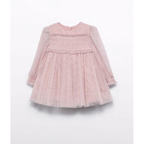 Vestina manica lunga cipria con pois malva in tulle e brillantini dorati. Rouches in polsino.