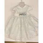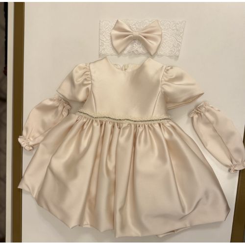 Abito in raso panna dorato con la manichetta ad aletta punto vita con punti luce e micro piumette, gonna a ruota, sul retro la chiusura lampo e un grosso fiocchettone tono su tono smontabile.