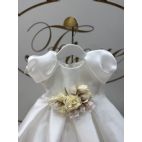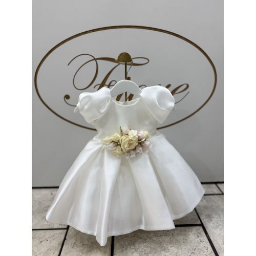 Brand: Isabel. Abito bianco elegante in organza a mezza manica semplice e allo stesso tempo romantico con fiore in vita a spilla( potete tranquillamente togliere).