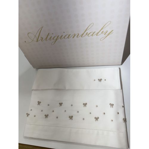 Lenzuola tortora con fiocchi e punto smock neutra sia per maschio e femmina. Ricamo a mano. Per carrozzina. Misura 90x120