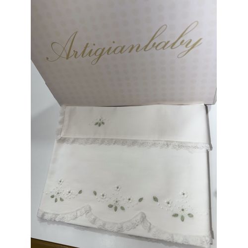 Lenzuola per carrozzina 100% puro cotone. Lenzuola elegante, raffinata e romantica con pizzo al bordino, ricamo a mano con fiorellini bianche e foglie verde effetto romantico ideale sia per maschio o femmina , comprende: sopra e fodera. Misura 90x120. Made in Italy