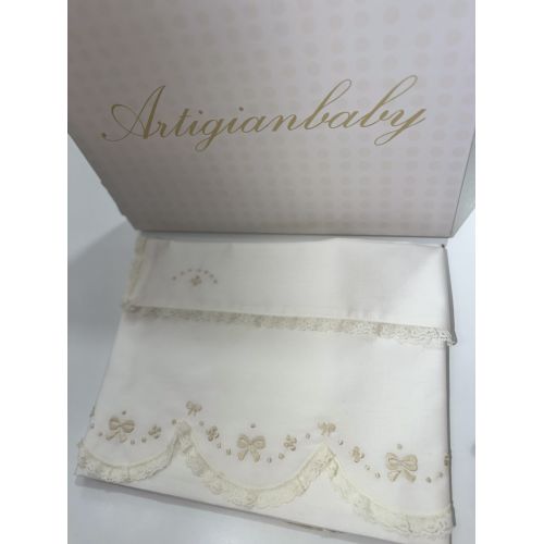 Lenzuola per carrozzina panna con nodo d'amore, fiocchi e punto smock tono su tonno con pizzo al bordo sia della lenzuola sia e la fodera.