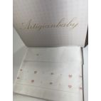 Lenzuolino per carrozzina bianca con fiocchi, punto smock e fiorellini ecrù. Sia per maschio e femmina. Comprende sopra e fodera.