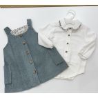 Vestina a salopette in velluto verde salvia con apertura avanti e bottoni marrone, tasche laterali e bodino bianco con collo e bordo con ruoches a fantasia foglie verde e marrone apertura in avanti.