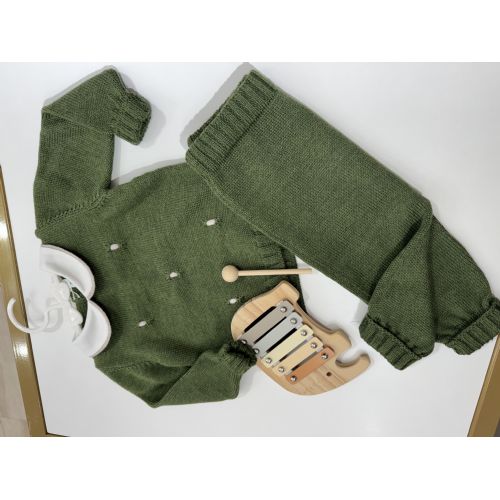 Completo 100% lana pettinata. Verde bosco con punti tortora. Prodotto artigianale. Made in Italy.