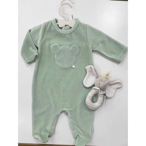 Tutina in ciniglia verde salvia, orsetto sul petto e dietro . Unisex