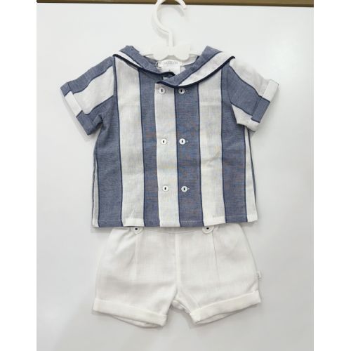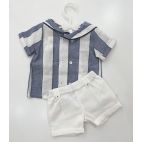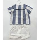 Brand: Deolinda. Completino Marinaretto con maglia a righe mezza maniche, apertura avanti e pantaloncino bianco. Colore: Bianco/ Blu. 60% cotone 40% Lino. Made in Portugal.