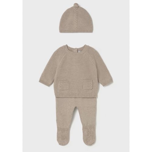 Completino 3 pezzi in caldo cotone. Comprende: maglioncino manica lunga, ghettina e cappellino. Unisex.