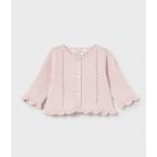 Brand: Mayoral. Completo 3 pezzi: maglia bianca maniche corta di cotone, cardigan rosa in filo di cotone e cuolotta con fiorellini. 100% cotone.