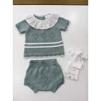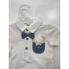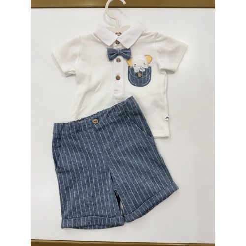 Brand: Melby. Completino con maglia a Polo in piquet con papillon e pantaloncino elasticizzato effetto jeans rigato, molla dietro e regulatore al interno. 100% cotone. Made in Italy.