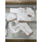 Completino in filo di cotone manica lunga e gamba lunga con colletto ricamato con cavalluccio a dondolo azzurro, cappellino, babbucce e bavetta coordinata. 100% cotone. Made in Italy.