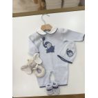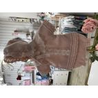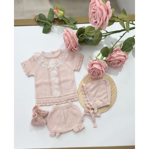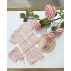 Completino in filo di cotone, maglia con merletto e bella elaborata, culotta, cuffia e scarpini. Colore: Nude.