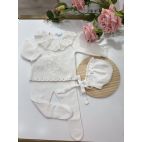 Brand: Mac Ilusión. Completino 4 pezzi. Maglia traforata mezza maniche con merletto, culotta, cuffia e babbucce.