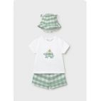 Brand: Del Sur. Tema: Trieste. Completino con camicia beige e pantaloncino a cuolotta con righe ampie verde chiaro e beige, elastico dietro. 100% cotone.