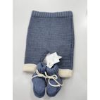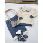 Brand: Bebè di Almy. Completino in lana, maglia panna con bordo sulle maniche e vita azzurro, collo con bodino azzurro, pantalone azzurro con dettagli panna, babbucce coordinate. 100% Lana merino. Made in Italy.
