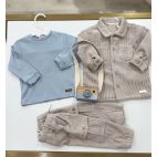 Brand: Minibanda. Completo 3 pezzi con camicia e pantalone in velluto tortora e maglietta in caldo cotone azzurro polvere maniche lunghe con polsini. Made in Portogal.