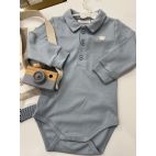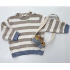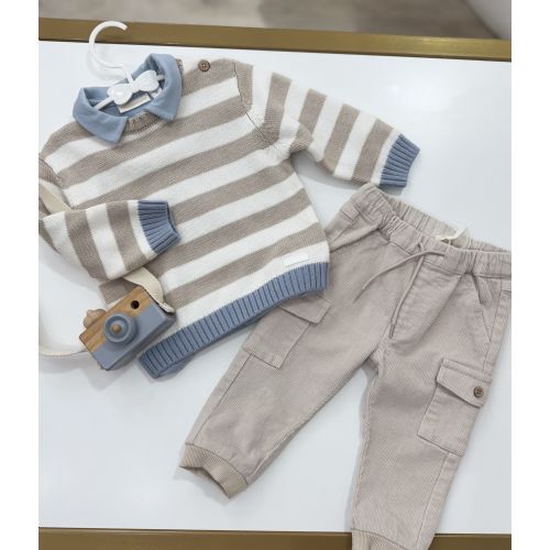 Completo 3 pezzi con maglioncino a righe panna/tortora e polsino e vita azzurro polvere, pantalone lungo in velluto tortora con tasche laterali e lasceto in vita e body in caldo cotone a camicia azzurro polvere.