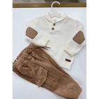 Mangione panna collo a V con due botone in cocco con tope sui gomiti e pantalone in velluto camel con tasche laterale. Maglione 80% cotone e 20% lana.Pantalone