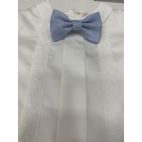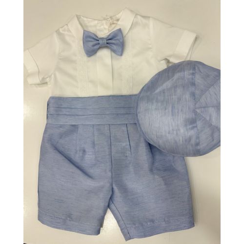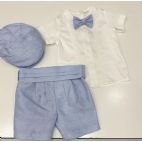 Completo cielo con camicia bianca ricamata, pantaloncino, papillon e coppola in tinta.