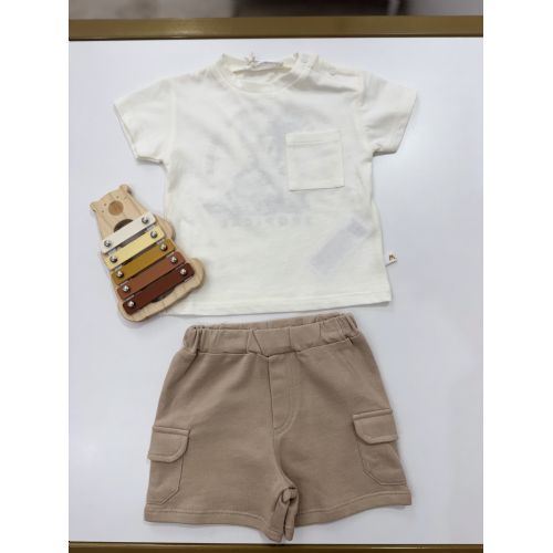 Completino con maglietta manica corta beige e fantasia sulla spallla e pantaloncino corto tortora. 100% cotone. Made in Italy.