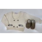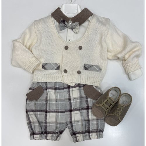 Completo elegante 4 pezzi, composto da : cardigan doppio petto con bottone rivestito in velluto millerighe color panna, camicina body in caldo cotone e collo in velluto millerighe, pantaloncino con bretelle effetto scozzese e papillon in tinta.