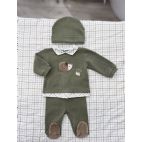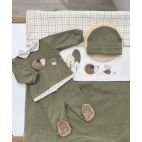 Coordinato nascita. Comprende: Completino con finta camicia a quadri, cappellino e copertina in ciniglia e caldo cotone.