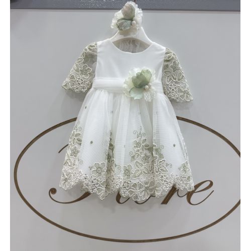 Vestina manica 3/4 in Macramé verde salvia con fiore laterali e fascia. Made in Italy.