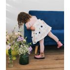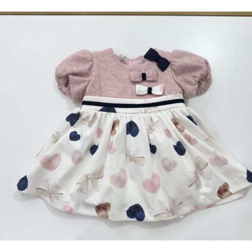 Vastina mezza manica in caldo cotone con corpetto rosa malva e tre fiocchetti, gonna a fantasia cuore e fiocco, vita un piccolo nastro in velluto blu dentro un po' di tulle che fa la ampiezza della gonna. Made in Italy.