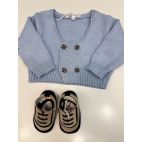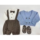 Completo elegante 5 pezzi. Comprende: cardigan azzurro doppio petto con bottoni rivestiti in pied de poule, camicina body in caldo cotone con bottoni rivestiti in tinta , pantaloncino con bretelle e papillon in pied de poule.