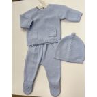 Completino in maglia spezzato cielo con cappello ricamato a triangoli piccolo pom pom. Caldo cotone