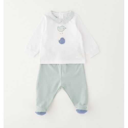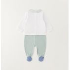 Tutina due pezzi con piede per neonato Minibanda. Il completo clinica è realizzato in jersey stretch di cotone. La maglietta ha il colletto, applicazione ricamo davanti e apertura dietro con bottoni a pressione. La ghettina ha l'elastico in vita ed il sotto dei piedini realizzato a contrasto colore.