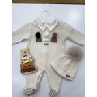 Tutina bianca in lanetta con tre cappellini sul petto ( verde - panna - marroncino e pelliccia sopra) e cappellino con pelliccia panna.