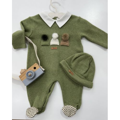 Tutina in lanetta verde oliva con tre cappellini sul petto con pon pon a pelliccia, cappello coordinato. Made in Italy.
