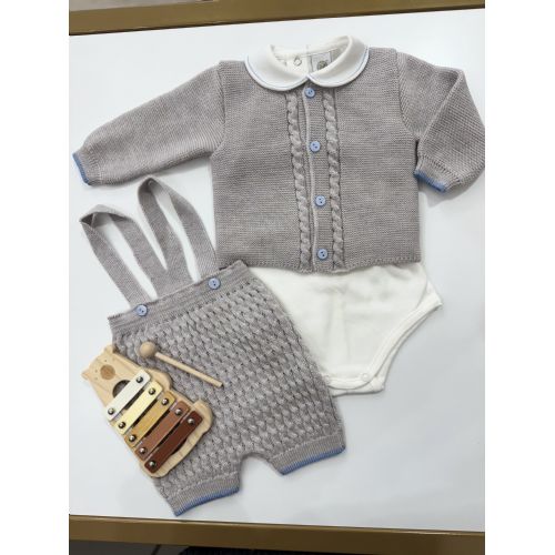 Pagliaccetto 3 pezzi comprende: body con colletto e bordino cielo al in caldo cotone manica lunga, cardigan grigio chiaro elaborato a treccia e salopetta corta colore grigia con bordino cielo.