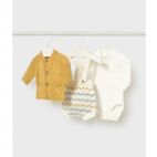 Comprende: Cardigan Senape dietro dinosaurio verde, pagliaccetto con righe senape/verde e brettelle, bodino con collo in caldo cotone. Potete metterlo sia periodo invernale che fino a primavera. 100% cotone