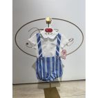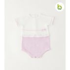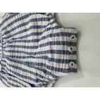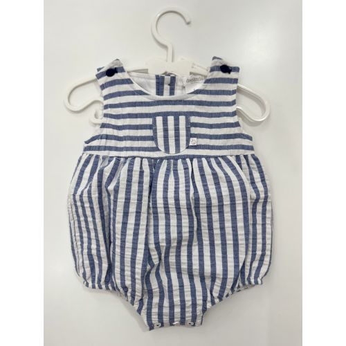 Brand: Deolinda. Pagliaccetto a giro maniche con righe orizzontali e verticali blu e bianco, bottoni sul retro. chiusura sotto le gambe con bottoni. 100% cotone. Made in Portugal.