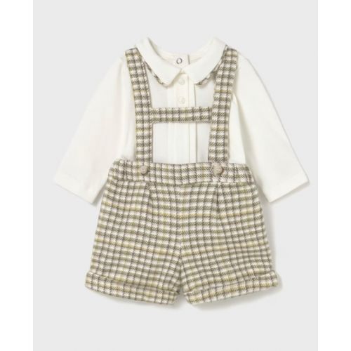 body manica lunga colletto modello camicia ,chiusura con bottoni a presione nella parte posteriore..chiusura con bottoni a presione nell'interno cosce per agevolare la vestibilità. Chiusura con bottoni nella parte anteriore, pantaloncino motivo pied de poule con bretelle, elastico in vita,dettaglio con orlo con risvolto,