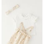 Salopette in satin dalla fantasia all over con apertura nel sottogamba con bottoni a pressione. Fascia con fiore in voile in abbinamento. Scegliendo i nostri prodotti in cotone, sostieni l'impegno di Minibanda nello missione Better Cotton.