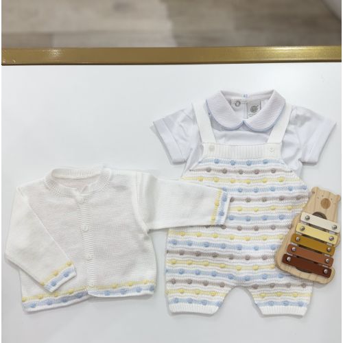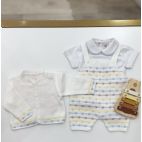 Brand: Marlú. Completino 3 pezzi: pagliaccetto, body e cardigan. Colore: Bianco/Cielo Polvere/ Multicolor. 100% cotone. Made in Italy.