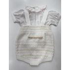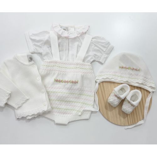 Brand: Marlú. Set nascita a pagliaccetto Femmina con camicina con colletto ruoches bordino rosa con cardigan bianco, cuffia e babbucce ricamati. Colore: bianco rosa pesco lime. 100% cotone. Made in Italy.
