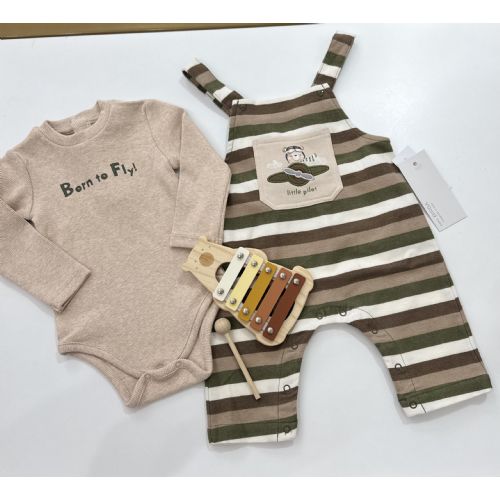 Brand: Birba. Salopette a righe verde/marrone/tortora e panna con body tortora manica lunga con scritta ( Born to fly ). Caldo cotone. Made in Italy 🇮🇹.