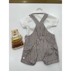 Brand: Melby. Salopette a righe con maglietta bianca a polo collo con piccolo bordo tortora e avion. 100% cotone. Made in Italy.