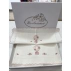 Lenzuola di cotone percalle con ricamo a mano mongolfiera. Comprende: sopra e fodera del cucino. Prodotto artigianale. 100% cotone. Misure: 90x120. Made in Italy.