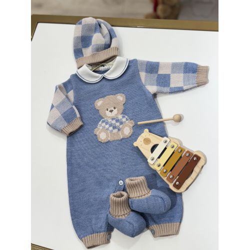 Brand: Marlú. Tutina con quadrettone e orsetto ricamato al centro, cappellino e babbucce coordinata! Col.Ottanio. 100 % lana pettinata. Made in Italia