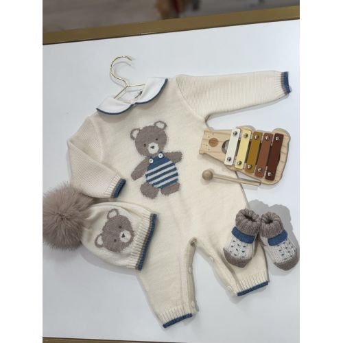 Tutina panna con orso al centro, cappellino con pelliccia vera e babbucce coordinate. Colori: Latte/Tortora/Verde Ottanio.