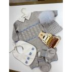 Tutina grigia con elaborazione in colore avion, cappellino con pelliccia vera , bavetta e babbucce. Tessuto doppio come filato Misto Lana. Made in Italy