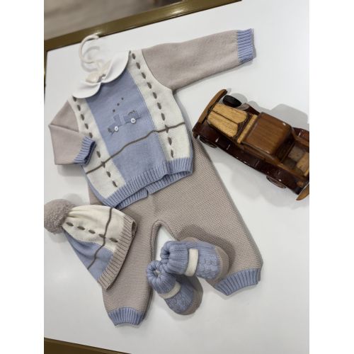 Brand: PRIMODì. Completino tema treno. Maglia con trenino tortora/azzurro/panna e ghettina tortora con bordino azzurro, cappello e babbucce coordinate. Prodotto artigianale.