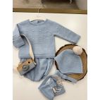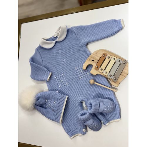 Tutina azzurra con punto smock bianche, cappellino azzurro con pelliccia bianca e babbucce coordinate. 100% lana pettinata.