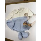 Brand: Pappa & latte. Pagliaccetto bicolore cielo e panna in misto Lana, cappellino e babbucce coordinate. 50% lana 50% acrilico. Made in Italy.