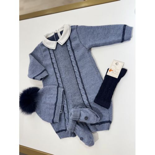 Tutina effetto jeans con collo bianco e trama blu. Cappello e babbucce coordinate.